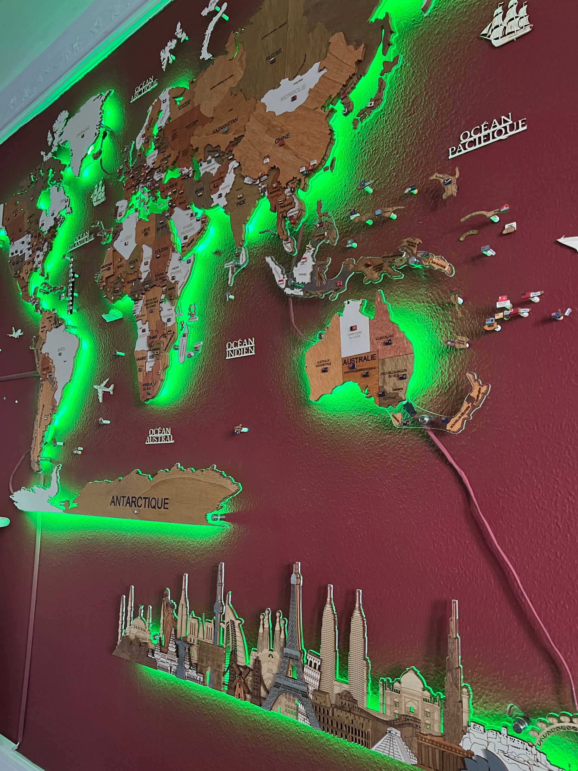 An elaborate wooden wall decoration with acrylic plexiglass base, LED backlighting, connector and stainless steel stands for installation with the LED wooden world map.