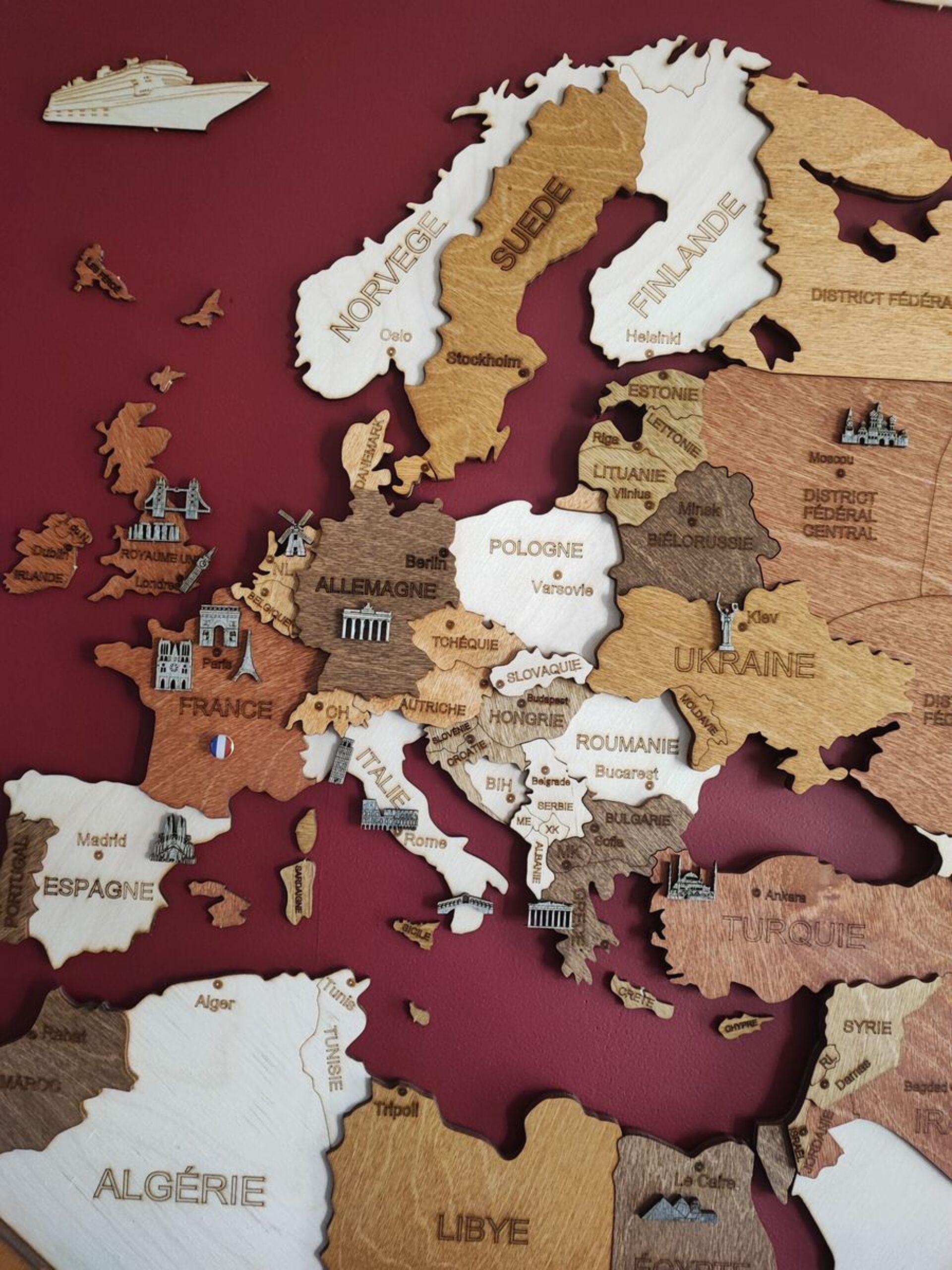 The individual landmarks are manufactured to be legible and very detailed. They are not in the exact scale and for our smaller wooden maps (or for smaller countries), it is possible to glue monuments in the vicinity of the country, or outside the actual continents.