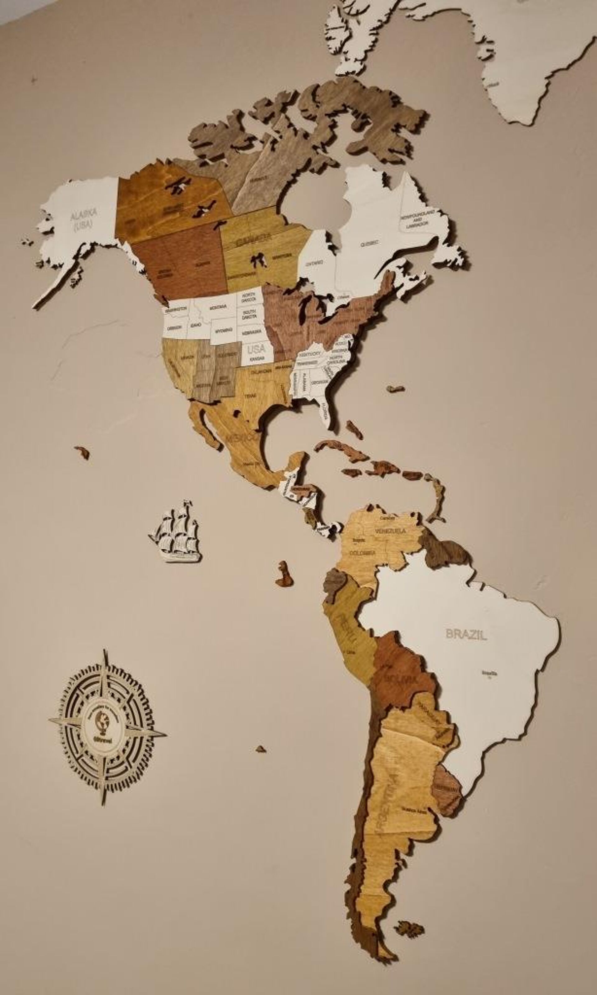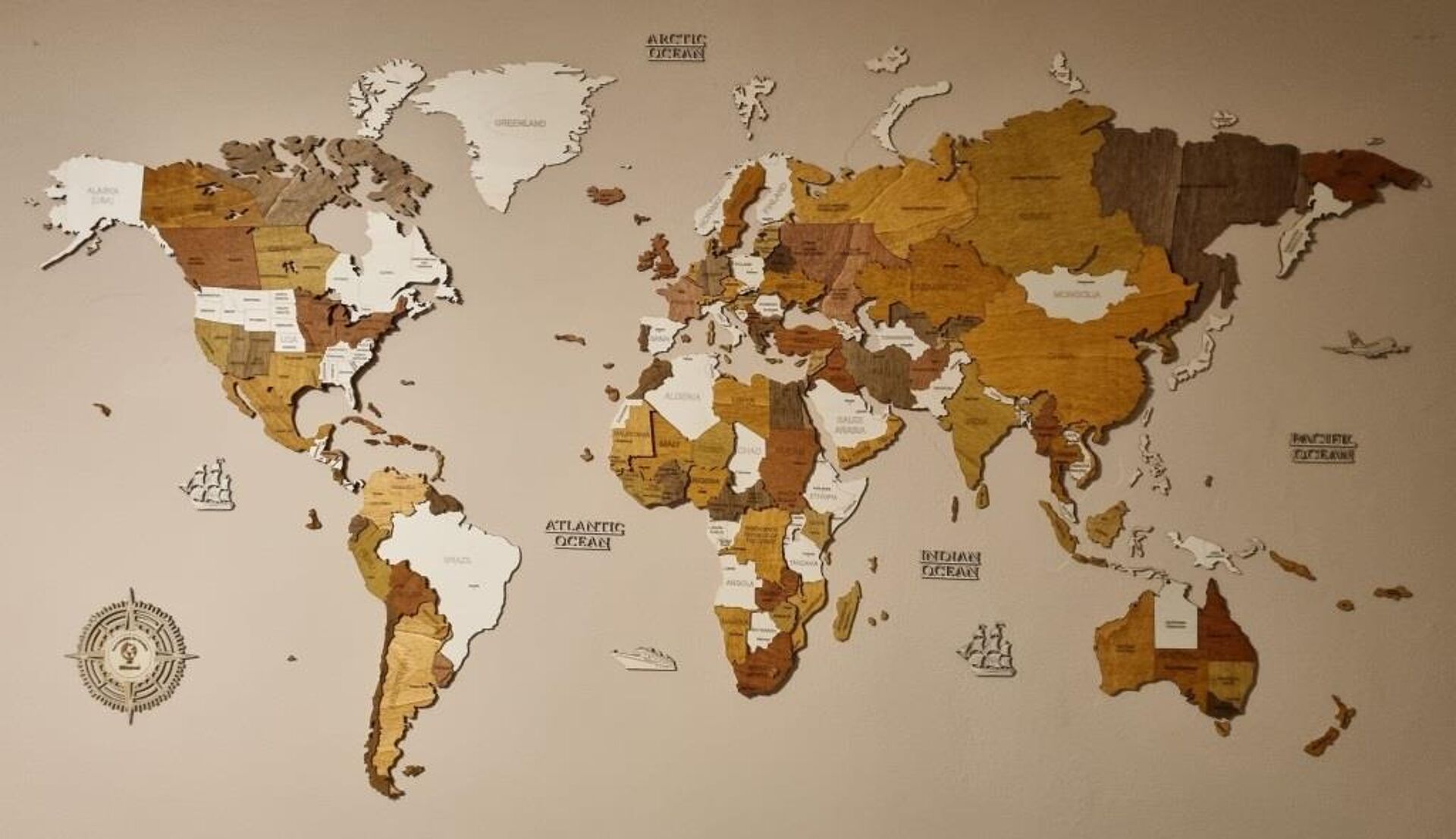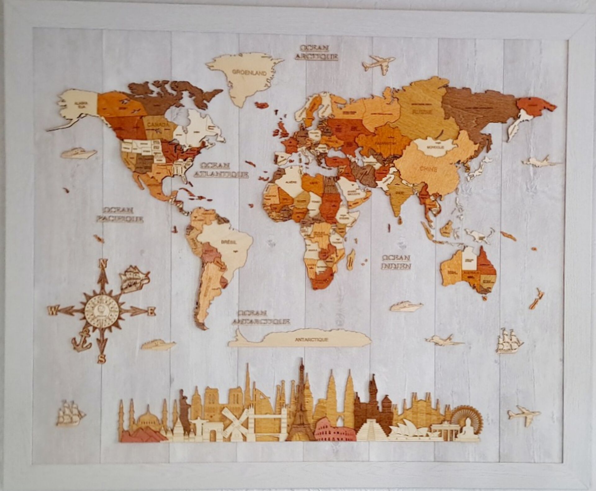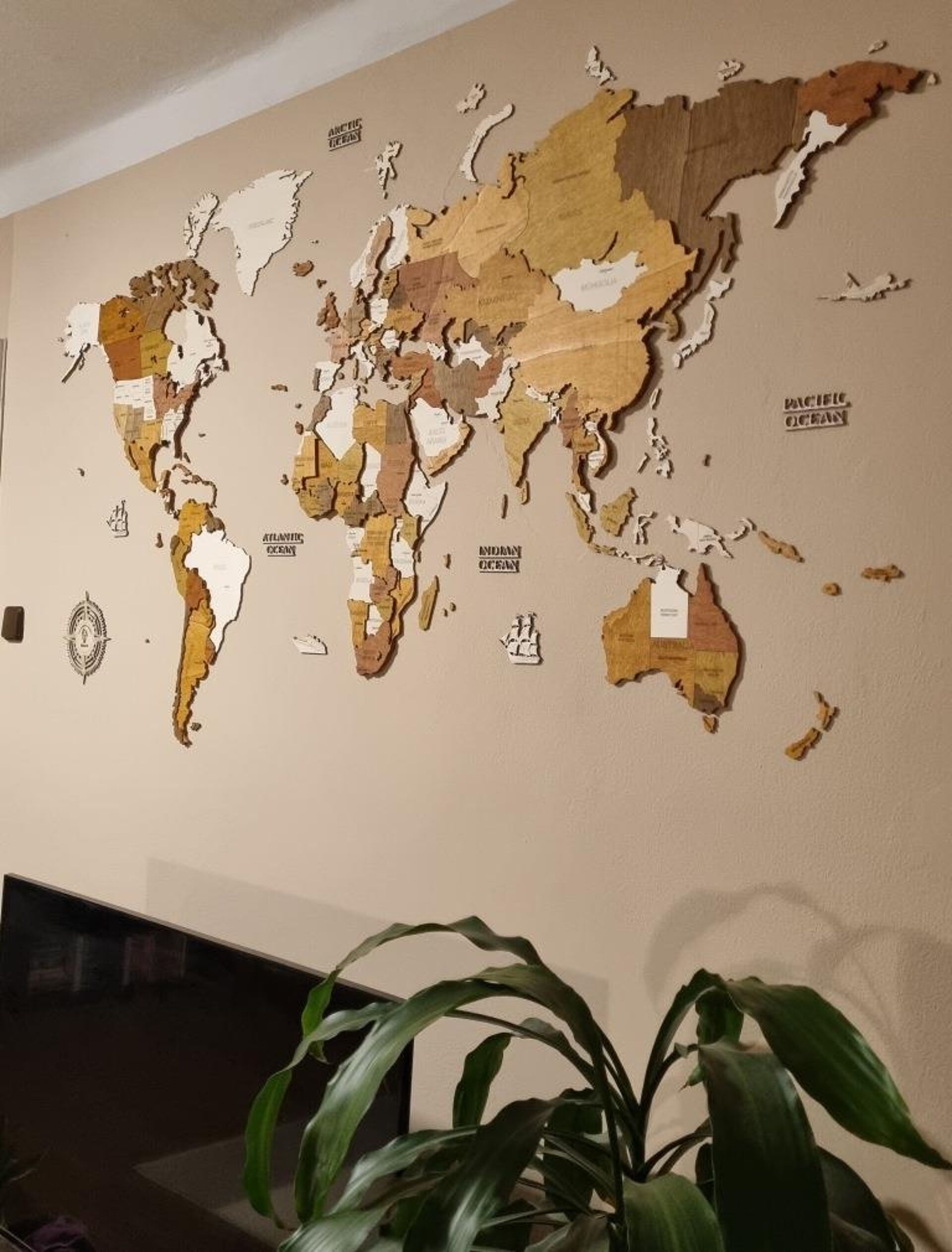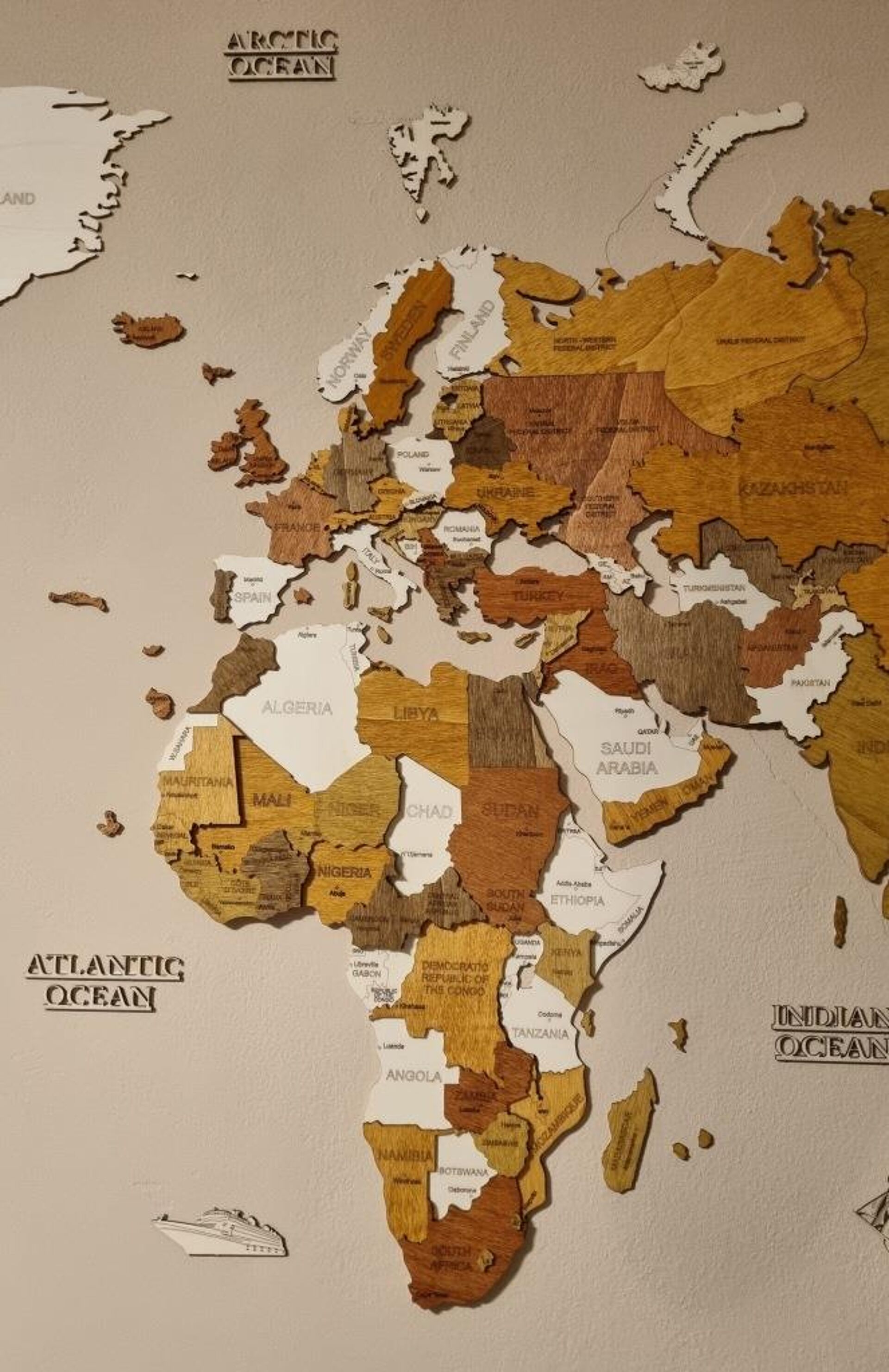 3D Wooden World Map is the perfect way to get our whole World on the wall of your room, hall, living room, office or cottage. Maps have always had their charm and they always attract people's attention. These breathtakingly large wall decorations feature layered wood panels. Combination of cutting, engraving and manual staining and glueing creates an original and valuable product. These techniques create an amazing 3D effect that will give life to any wall space and will please the heart and soul of any travel lover.