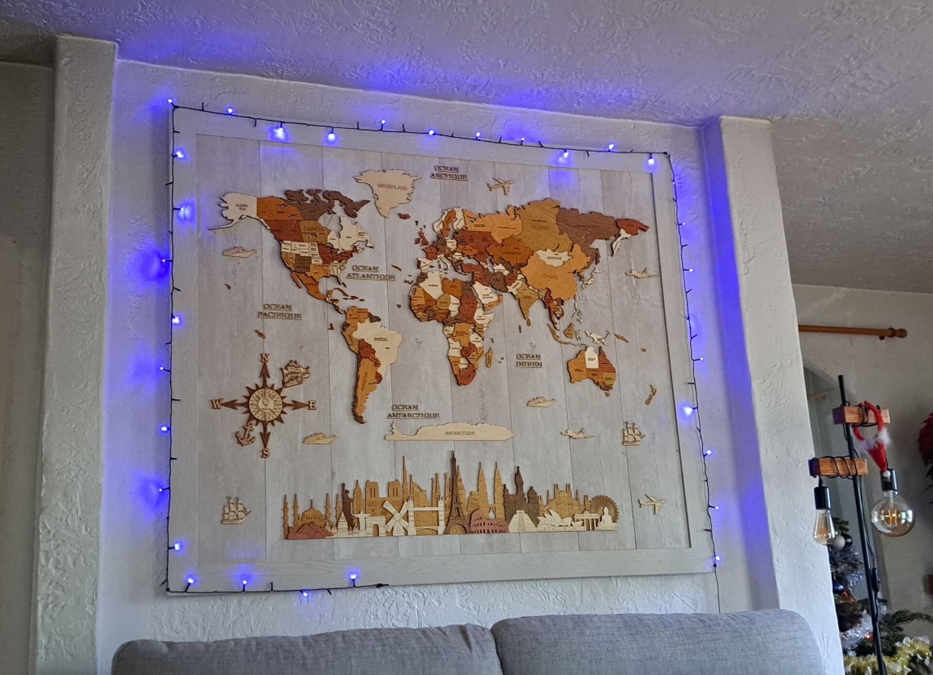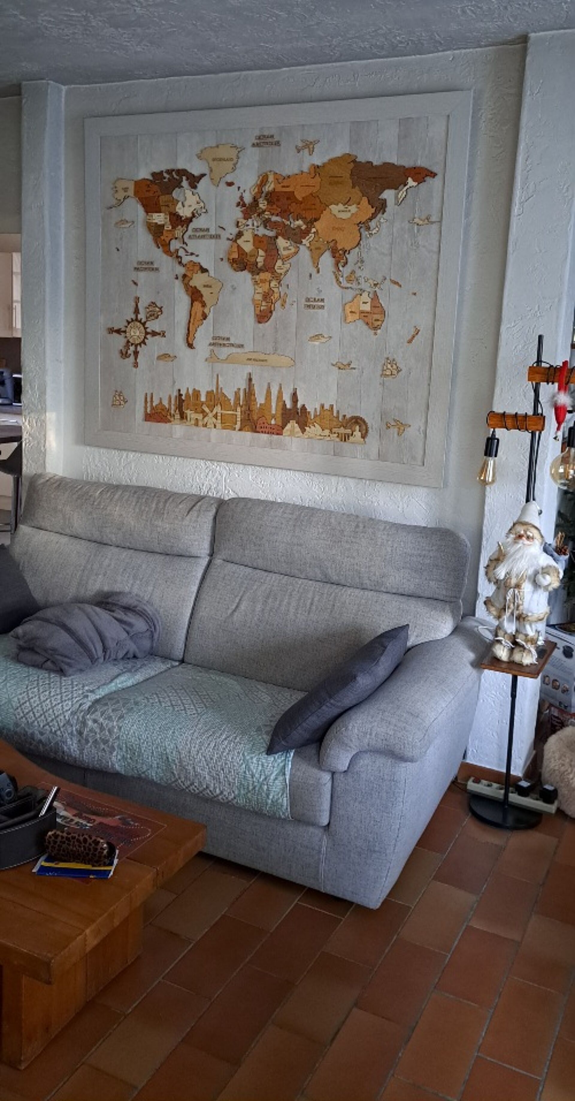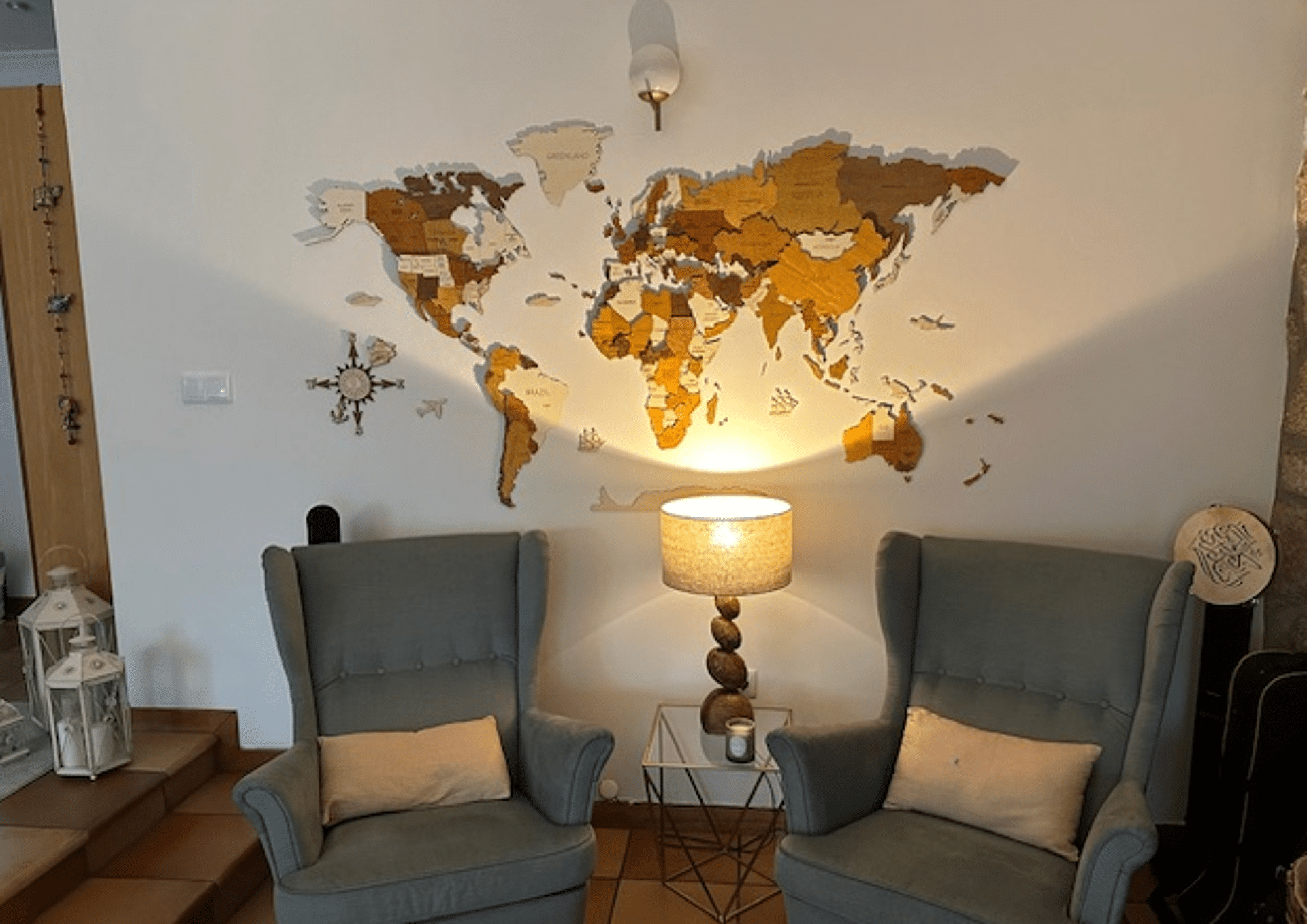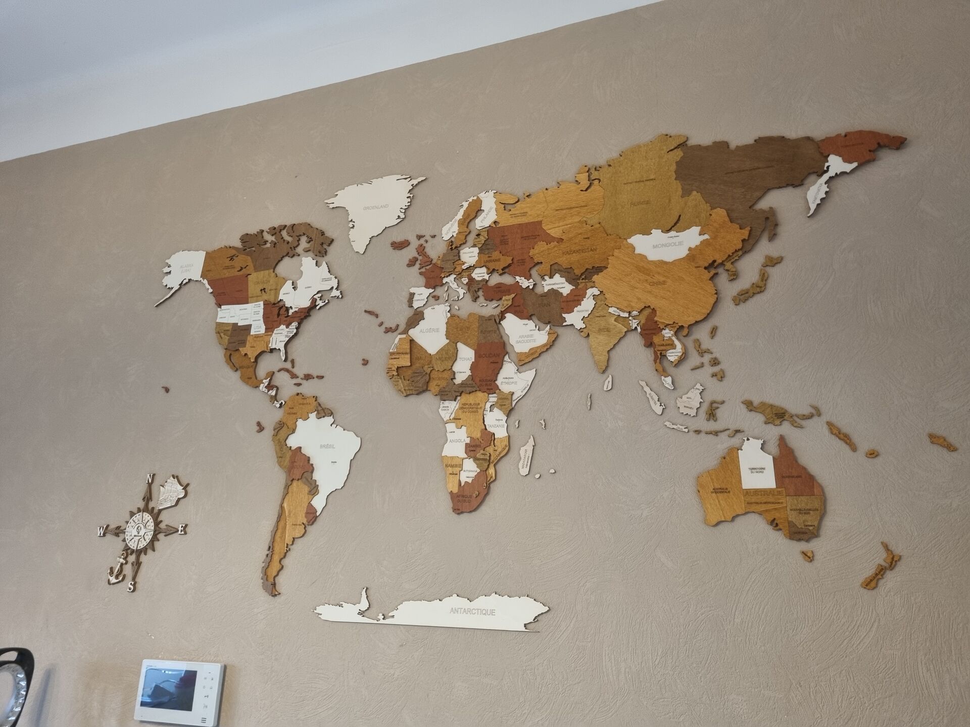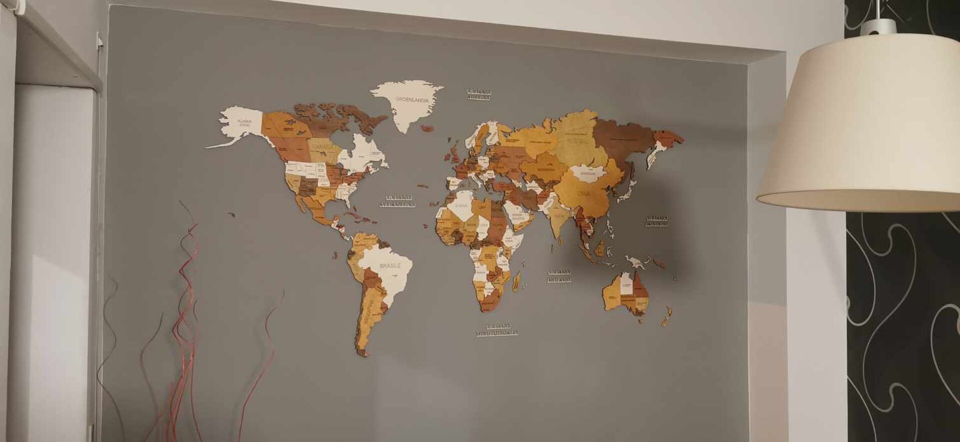 3D Wooden World Map is the perfect way to get our whole World on the wall of your room, hall, living room, office or cottage. Maps have always had their charm and they always attract people's attention. These breathtakingly large wall decorations feature layered wood panels. Combination of cutting, engraving and manual staining and glueing creates an original and valuable product. These techniques create an amazing 3D effect that will give life to any wall space and will please the heart and soul of any travel lover.